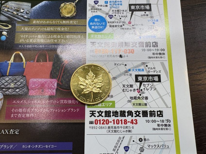 鹿児島市 買取専門 東京市場 天文館 地蔵角交番前店 外国 コイン メイプルリーフ 金貨 買取しました。