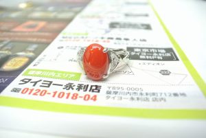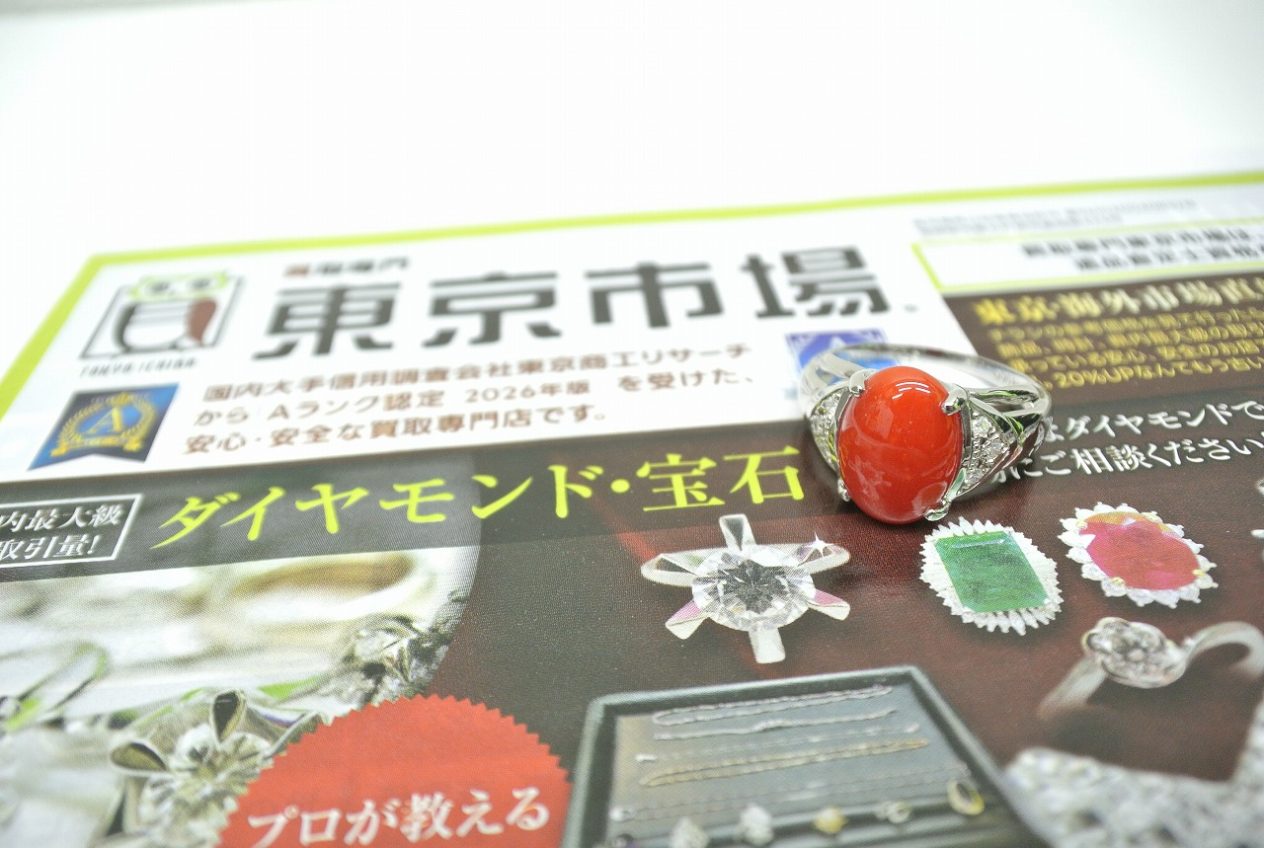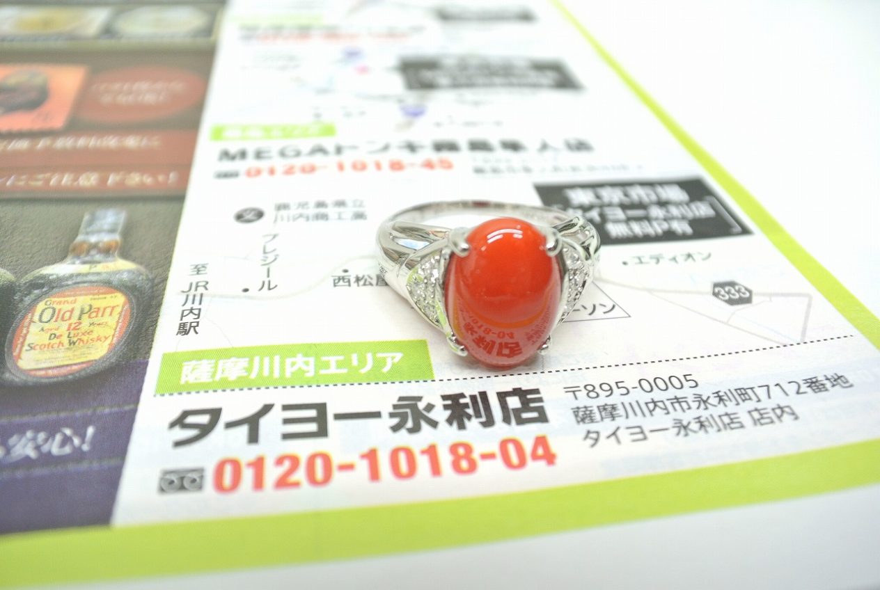 鮮やかな赤色が印象的な珊瑚の指輪。珊瑚は宝石の中でも自然素材ならではの