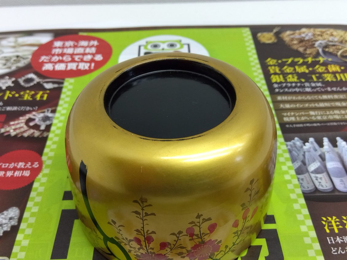華やかな金彩を背景に、紅白の梅が描かれており、昭和の風情を感じさせるデザインです。